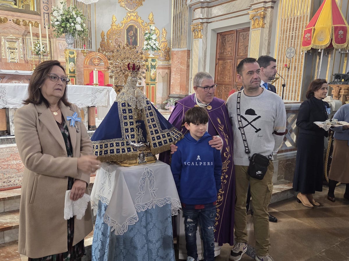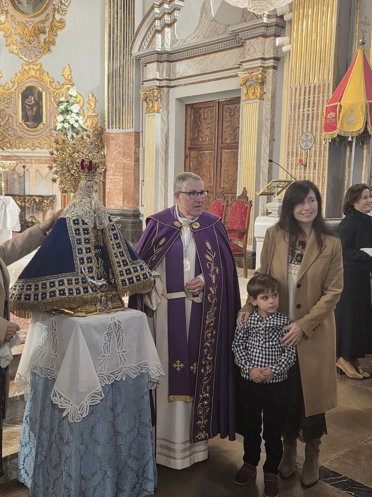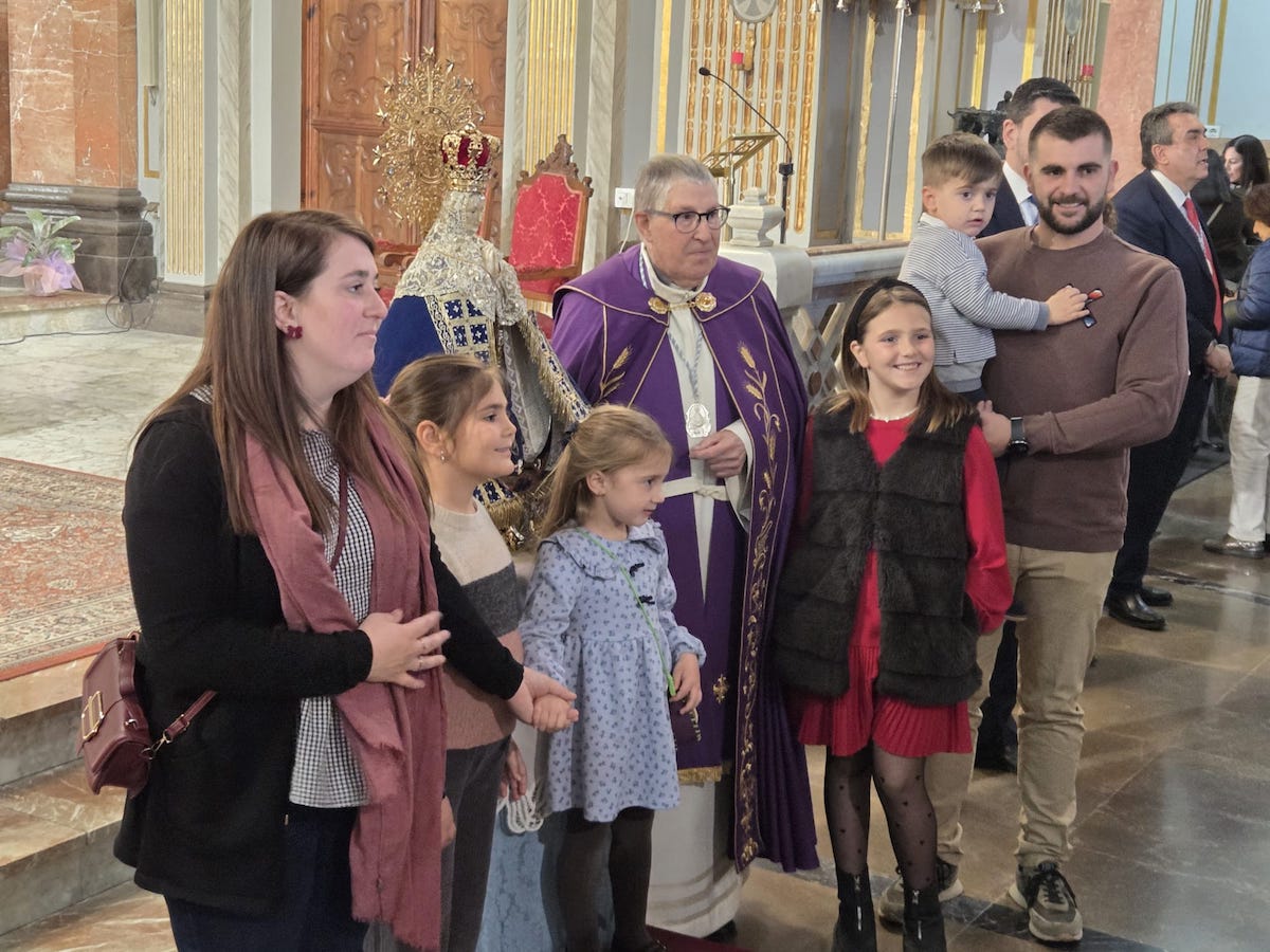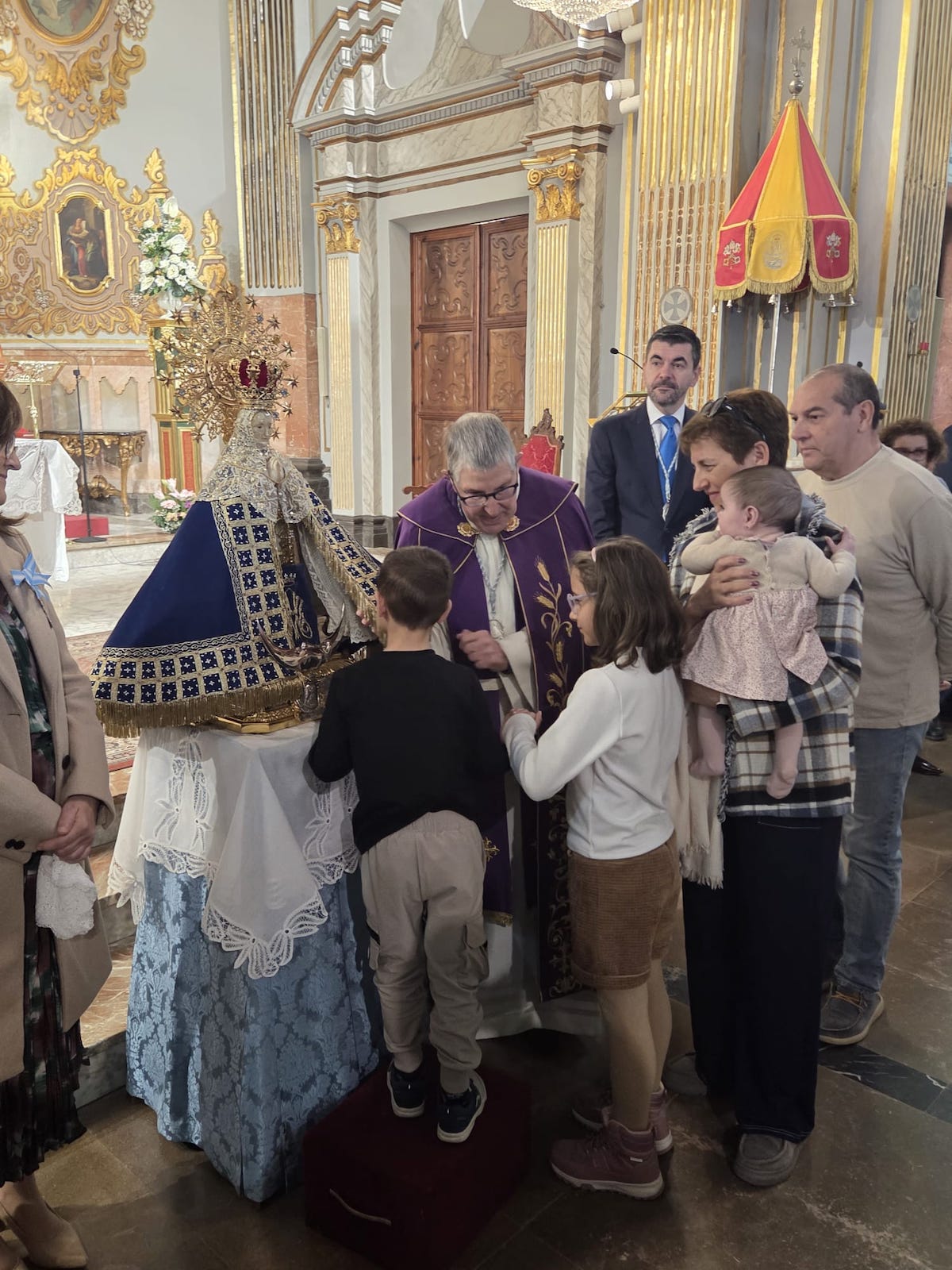 Numerosas personas y familias, acompañadas de sus hijos e hijas, participaron el pasado domingo 22 de febrero de 2026 en el tradicional rito del paso por el manto de la Virgen del Lledó.